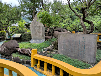![]() 烤亭前的巨石摹刻「大千居士乞食圖」 | ![]() 圍繞紀念館的外雙溪 |
