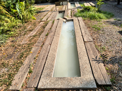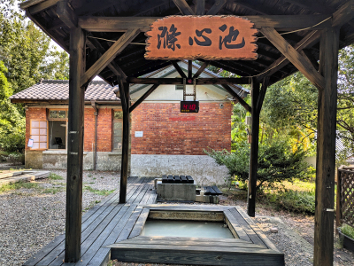 向陽心苑的園區範圍不大,以木造的療養所建築為中心,逛完庭園後可前往門口的足湯區,這裡的溫泉是白磺泉質,溫泉水色為白色,跟北投溪地區的青磺泉質不同,溫泉有增進新陳代謝功效,